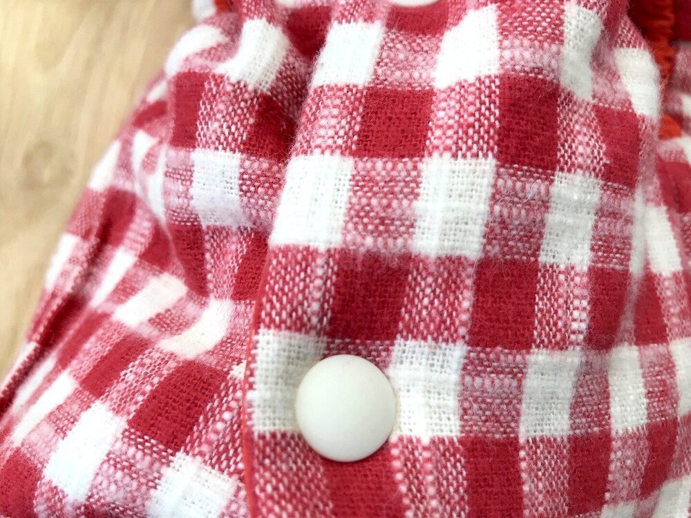 암홀이 들뜨거나 바람이 들어가지 않도록 고무줄봉재되어서, 아가들 체형에따라 뒤쪽에서 암홀이 눌려보이는 현상이있습니다.(화살표)